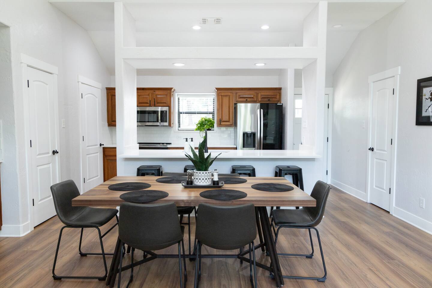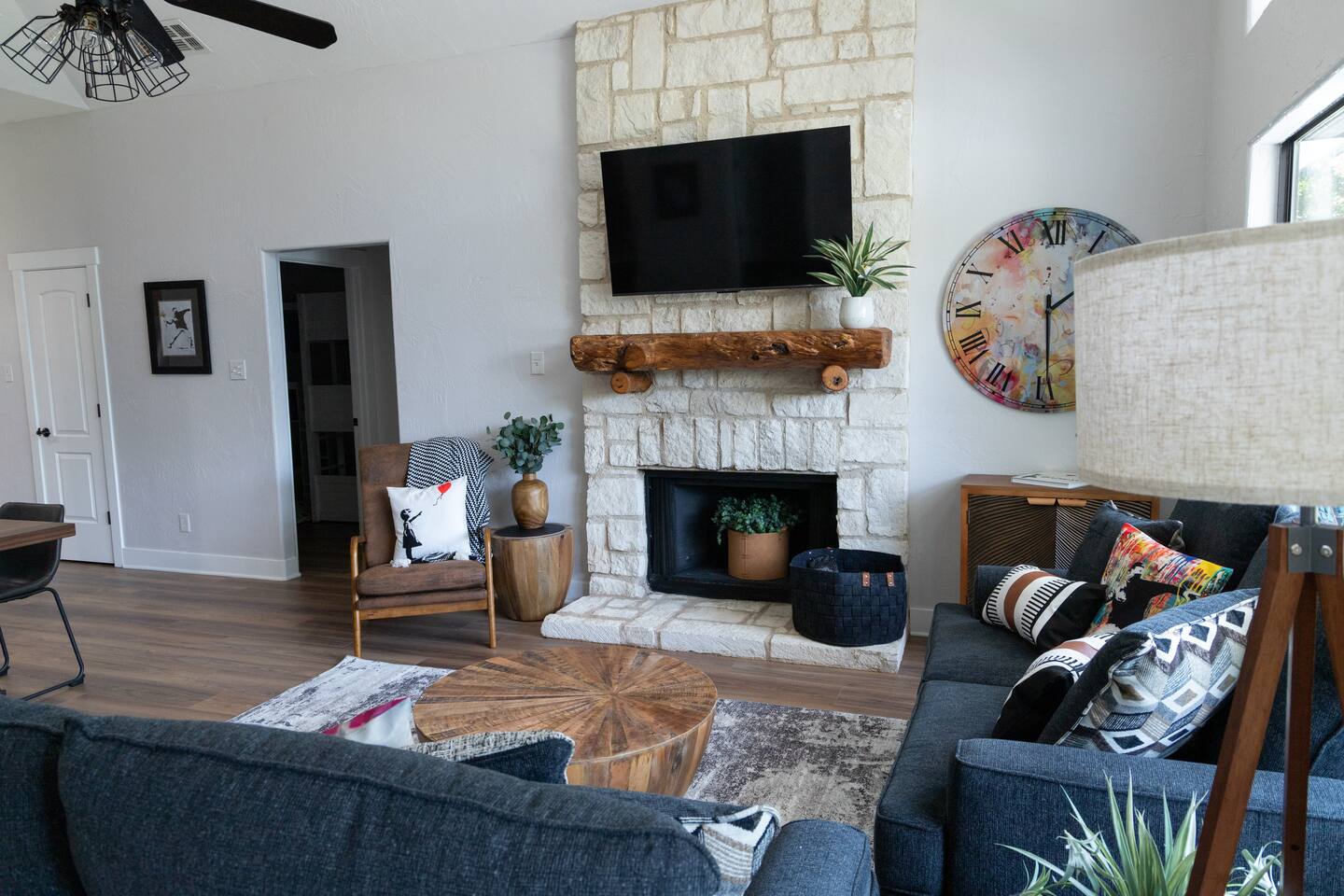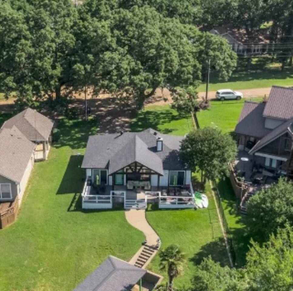 This contemporary, Banksy-inspired boathouse is just an hour from Dallas and sleeps 10. Hot Tub & kayaks included! Enjoy direct water access with a private boat lift and nearby neighborhood ramp. Nestled in a quiet area, this waterfront property features a deck with open cove views, 3 bedrooms (including a bunk room), 2 full bathrooms, an outdoor patio, grill, a coffee bar, and a fully stocked kitchen. Full day access on check-in or check-out days is available as an option, pending availability.