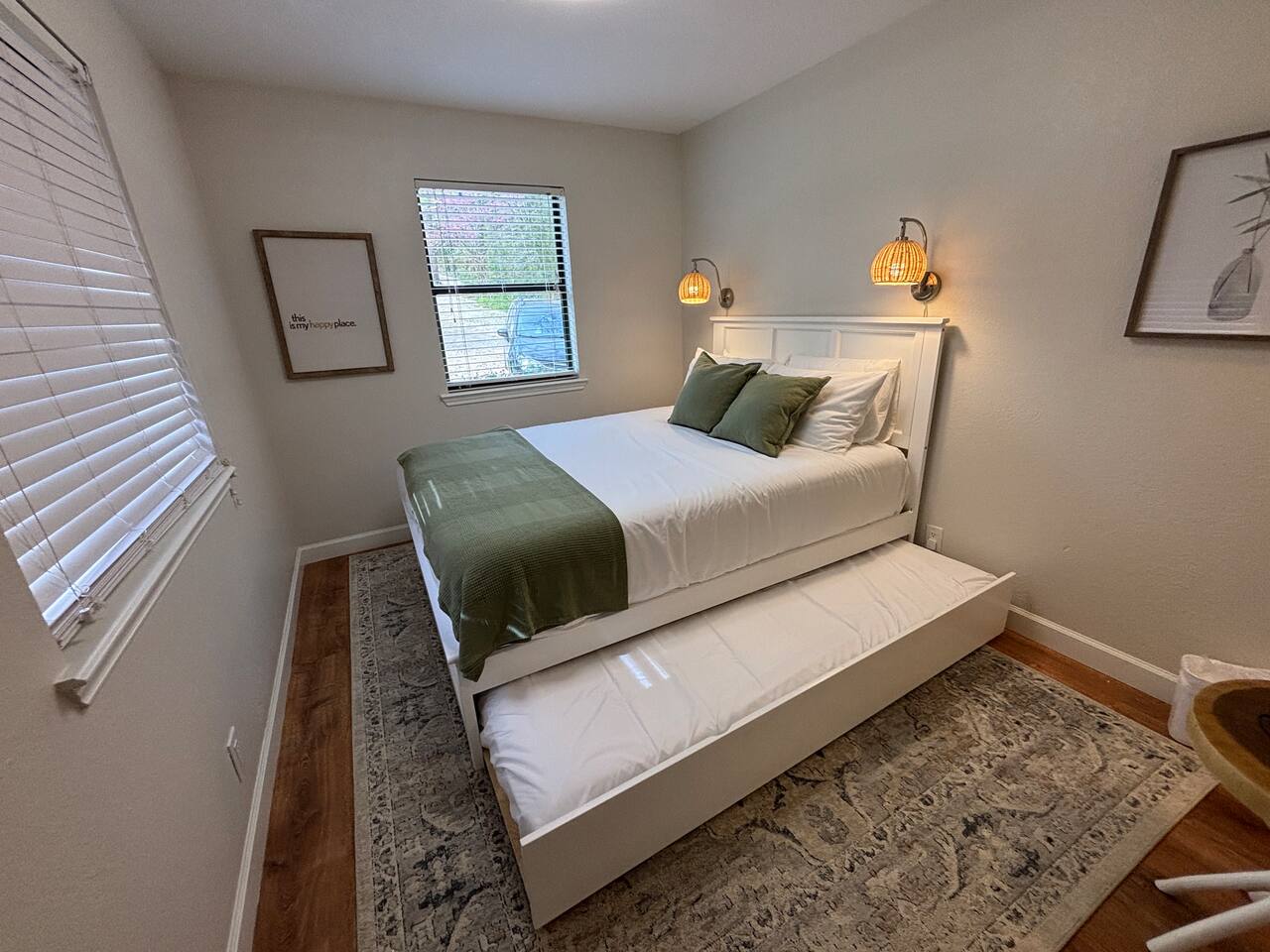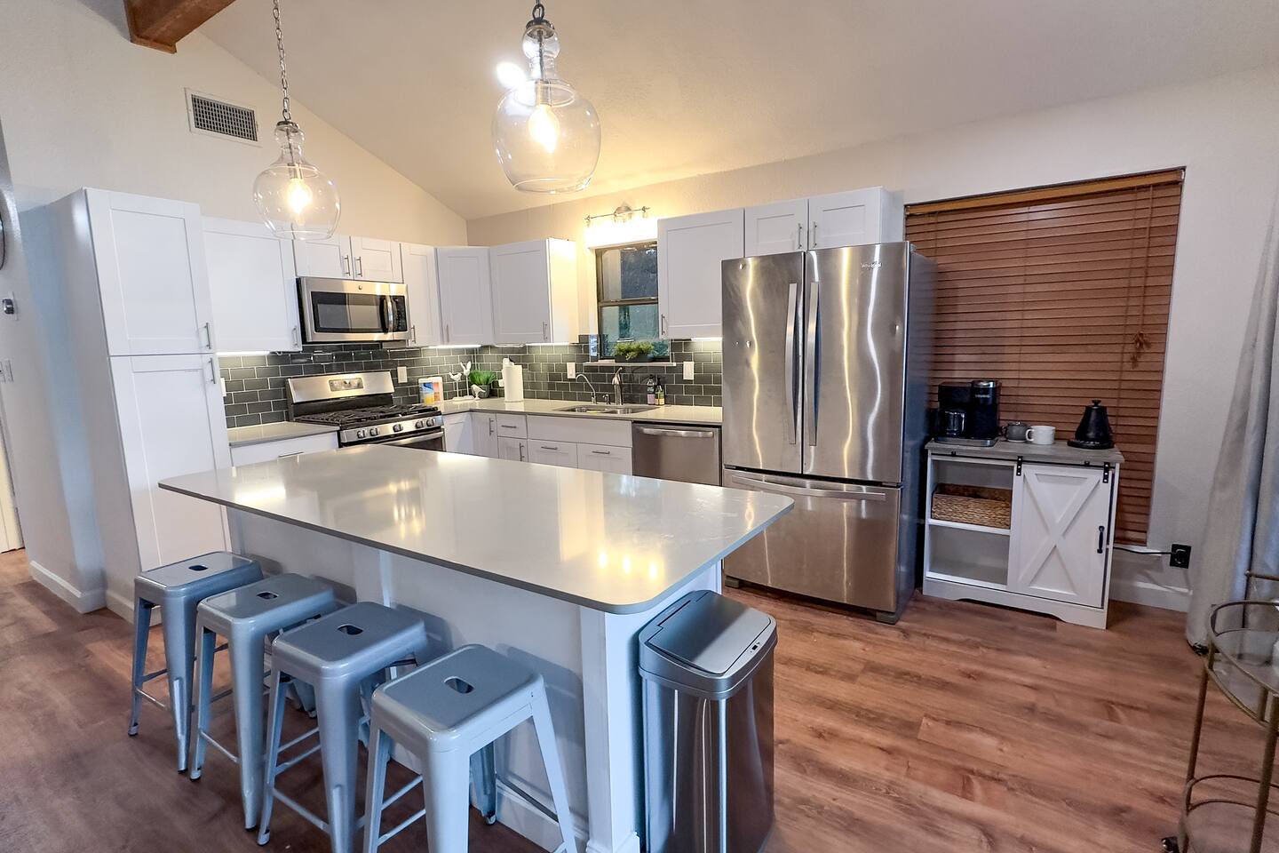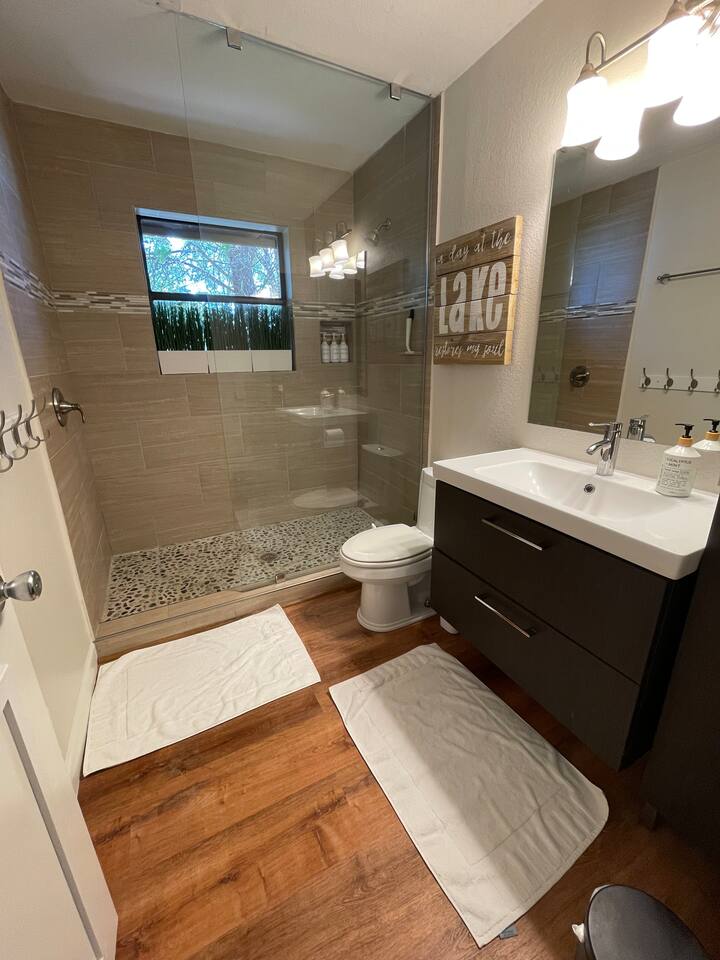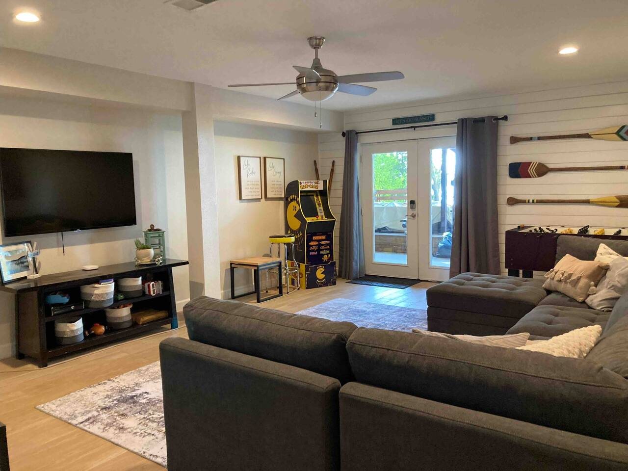 Everything is included in your stay except the jet ski's which are no accessible for guests. Parking The gravel drive way can easily accommodate 5 cars. No street parking. Outdoor Amenities Enjoy beautiful lake views from any point in the yard! -Outdoor shower (seasonal) -Ping Pong Table -Fire pit (firewood included) -Outdoor children’s playhouse -Hot tub -Spacious yard with lawn games -Grill -One open-air deck, patios -Ample outdoor seating and dining areas -Kayaks & paddleboards -Yard games (e.g., cornhole, croquet, bocce ball — game selection may vary) Indoor Living The open-concept main living area includes a fully stocked kitchen, dining space, and a cozy living room with a large sectional sofa and TV. Total table seating is for 10 with 4 bar stools at the kitchen island. We provide card and board games, throw blankets, and other comforts to make your stay relaxing and fun. Kitchen is fully stocked including a complimentary coffee bar! Bedrooms (5 total) Bedroom 1: Upstairs. King bed with optional twin trundle, closet with dresser and hanging space Bedroom 2: Upstairs. King bed, TV, closet with shelves and hanging space Bedroom 3: Upstairs. King bed, closet with dresser and hanging space Bedroom 4: Downstairs. King bed, closet with shelves, hanging space, pack-n-play, kids table & chairs & high chair in closet Bedroom 5: Downstairs. Bunk Room. 2 queen beds, 2 twin beds. Cabinet with shelves, hanging space,, black out shades. Downstairs living room: Large sectional, kids toys, walk out basement doors, pac man machine Bathrooms (3 total) Upstairs Bathroom: Single vanity, glass-enclosed shower Downstairs Bathroom 1: Single vanity, glass-enclosed shower Downstairs Bathroom 2: Single vanity, glass-enclosed shower, door to back porch. Laundry Washer, dryer, and laundry supplies (including detergent, iron, and ironing board) are available for guest use. -Liability waiver is required to confirm bookings. -Add on day access on check in/check out is an optional add-on pending availability. We do not offer refunds for low water levels or county burn bans limiting fire pit use. Off season for the lake is Oct-April and water levels are unpredictable.